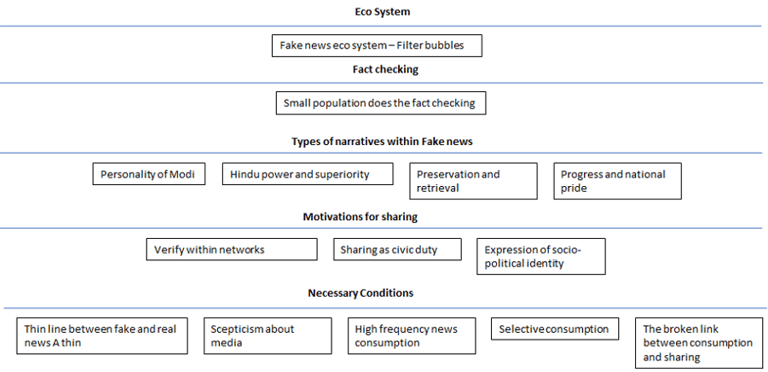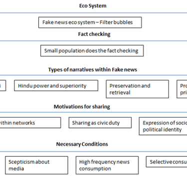 The bottom layer consists of five necessary conditions that will lead to the spread of fake news. The information available on social media should be in such a way that the information should be difficult to distinguish between fake and real news for a layman. Such news would only be accepted when there is low confidence in the mainstream media and there is high consumption of online information. From the above, it is clear that both conditions are present in India. Further, selective consumption is a behavioural trait of human beings. Even if it is a loose statement, the algorithms ensure that the information shown on the screens results from individual search history, forcing it to be selective. Finally, there is a broken link between consumption and sharing. Not all the information which is shared is consumed. Thus, sharing fake news becomes more rampant than consuming it. This base layer situation appears to be ripe in India. Motivation for sharing is an expression of identity and verification from the social group. People further believe that sharing the news over social media is a civic duty, which is true.